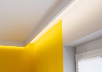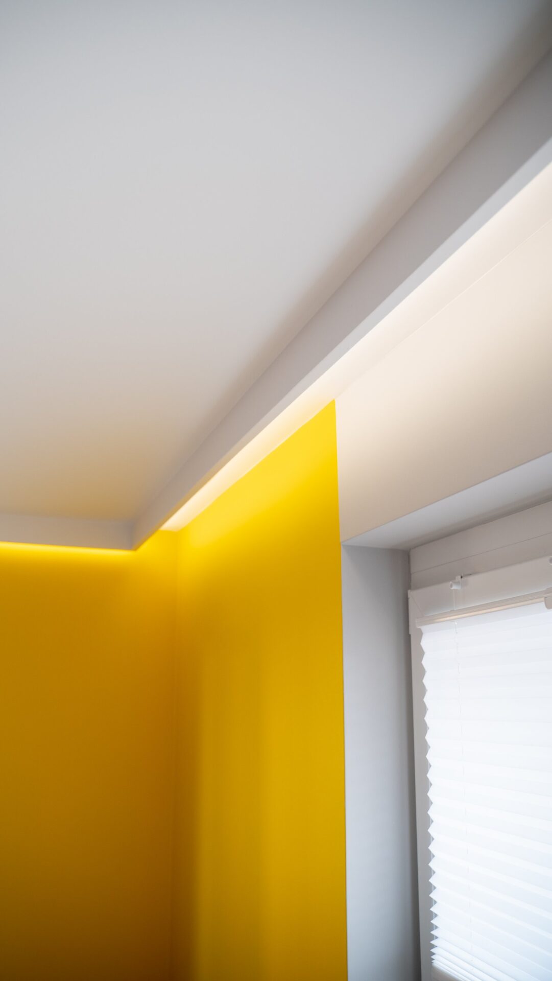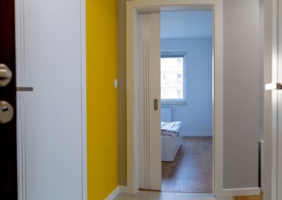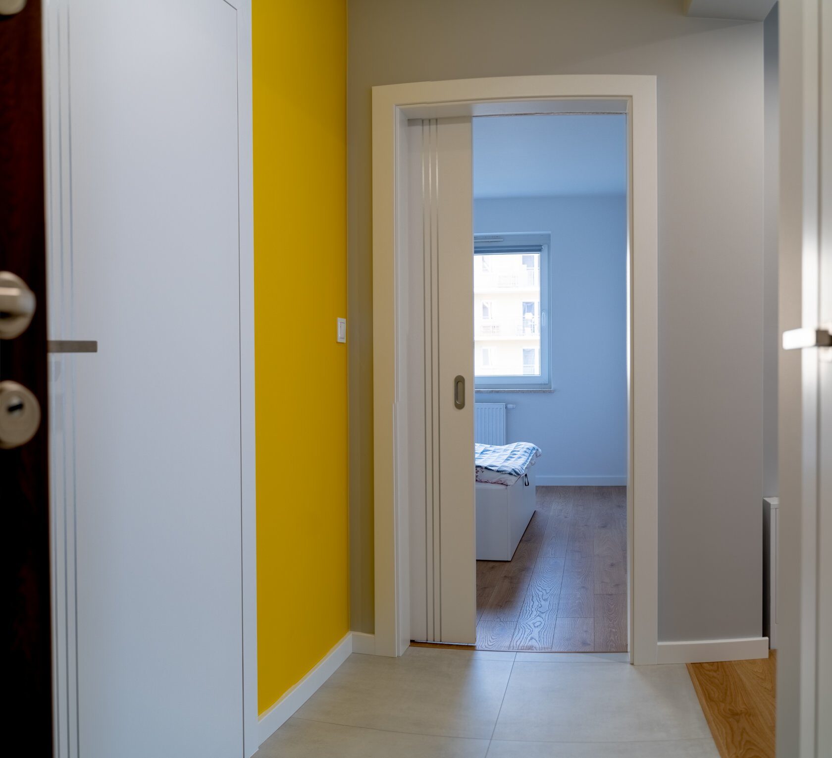 W pozostałych pomieszczeniach wykonaliśmy standardowy zestaw prac: na ścianach położyliśmy gładzie oraz farby, na podłogach panele, a w przedpokoju płytki. Duża przestrzeń salonu z aneksem kuchennym została ożywiona intensywnym, żółtym kolorem, który pojawił się również w przedpokoju, dając ciekawy, spójny efekt.