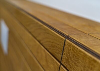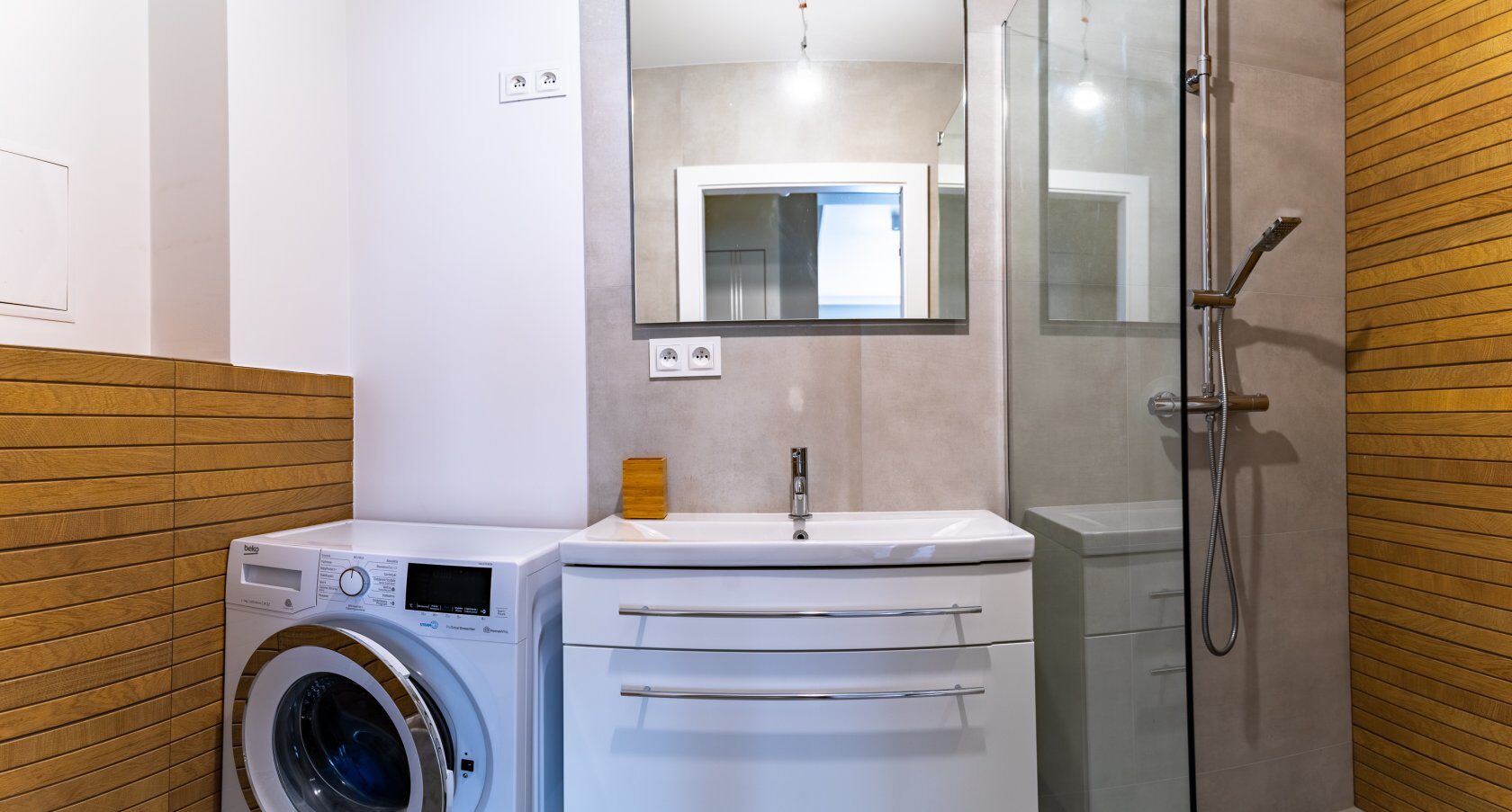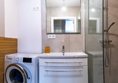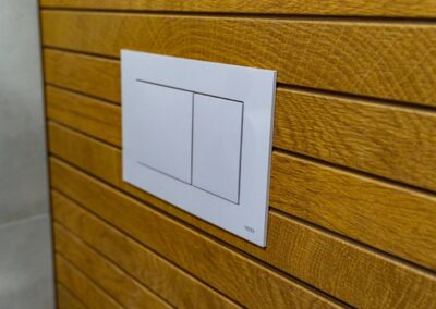 Najbardziej czasochłonnym pomieszczeniem okazała się łazienka – układaliśmy w niej 2 rodzaje płytek: duże, imitujące beton kwadraty (80 cm x 80 cm) oraz podłużne płytki (120 cm x 25 cm) z motywem drewna. Inwestorzy zdecydowali się także na prysznic typu “walk-in” z odpływem liniowym.